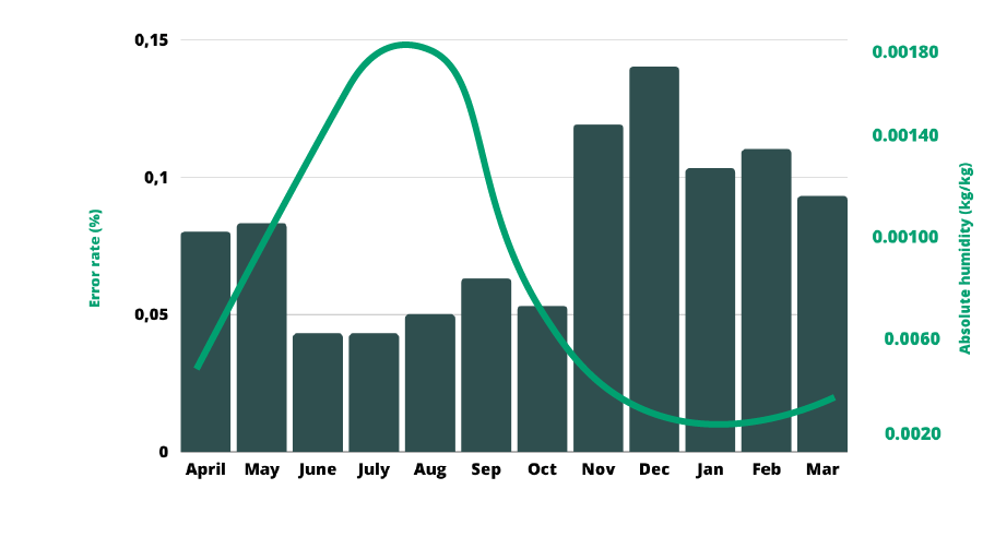 Die Fehlerquote ist in den kalten Monaten, in denen die absolute Luftfeuchtigkeit niedriger ist, deutlich höher