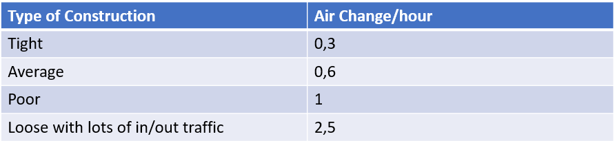 Jetzt müssen Sie nur noch die Lüftungsrate V berechnen, indem Sie das Volumen Ihres Raums mit dem Luftwechsel pro Stunde multiplizieren. Außerdem finden Sie hier einen Anhaltspunkt für den Luftwechsel pro Stunde in Abhängigkeit von der Bauweise Ihres Raums.