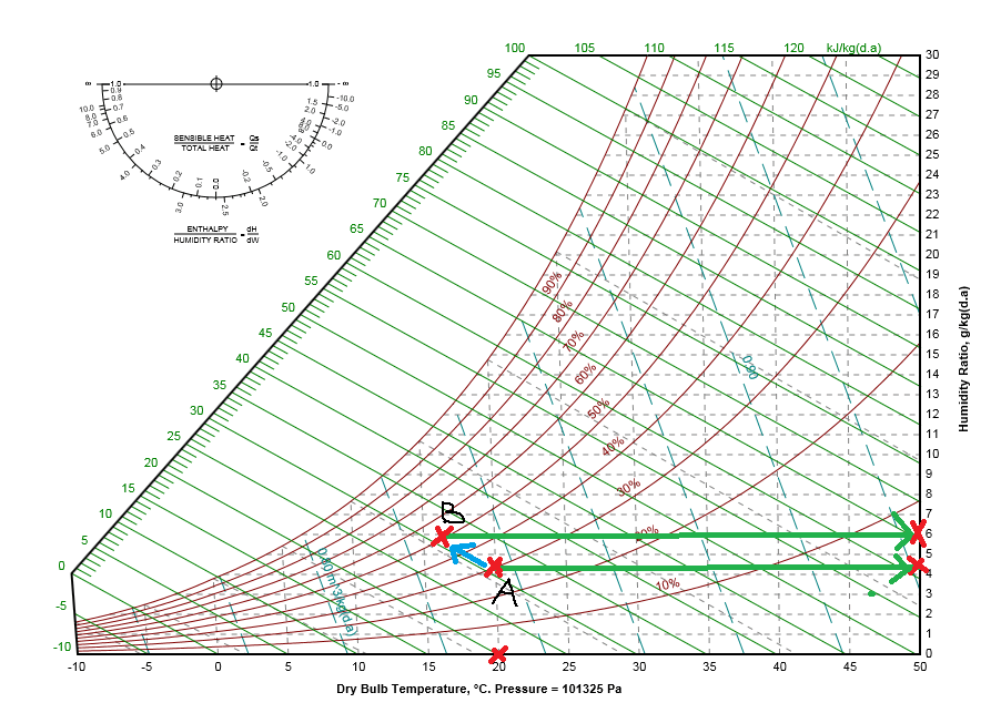 - Zunächst müssen Sie die Wassermenge in der Luft ermitteln. Dazu können Sie die Trockentemperatur (DBT) und die relative Luftfeuchtigkeit in der Grafik miteinander kreuzen. Markieren Sie den Schnittpunkt (A). Dann müssen Sie diese Werte auf der y-Achse ablesen, um das Feuchtigkeitsverhältnis zu ermitteln. Das Ergebnis für 20 °C und 30 % rF beträgt etwa 4,5 Gramm Wasser pro Kilogramm Luft.