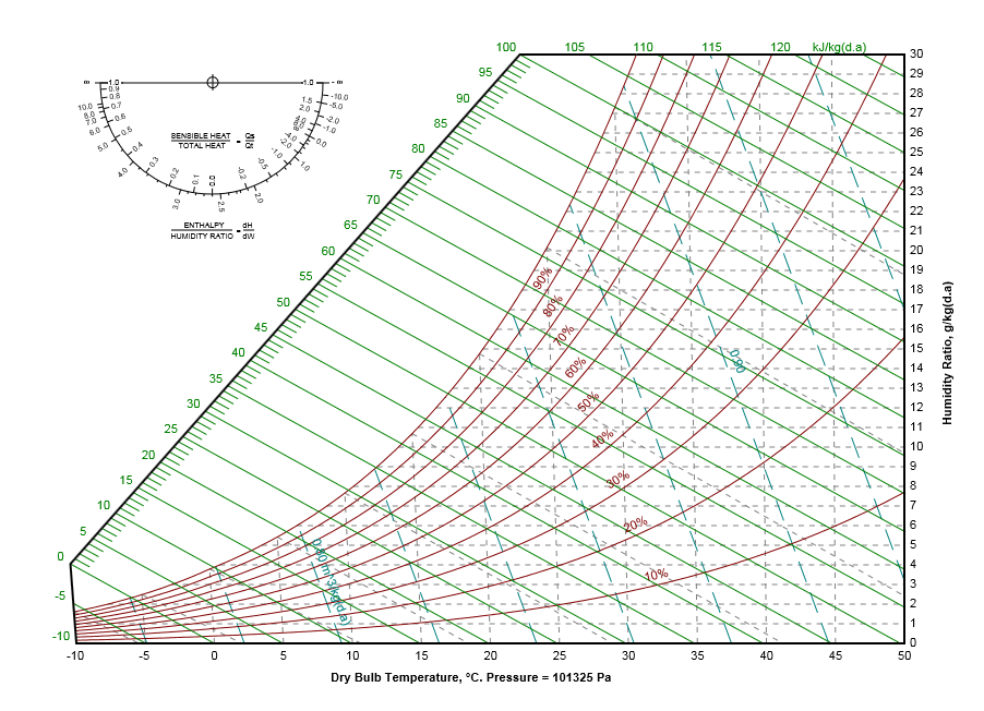 Betrachten wir zunächst die psychrometrische Tabelle, mit der Sie die erforderliche Befeuchtungsmenge bestimmen können. Dieses Diagramm zeigt die Eigenschaften von „feuchter Luft“ in Bezug auf relative und absolute Luftfeuchtigkeit. Es hilft dabei, Parameter wie Trockentemperatur (DBT), Taupunkttemperatur, absolute Luftfeuchtigkeit, relative Luftfeuchtigkeit und Enthalpie (die Gesamtenergiemenge in einem System) zu verstehen.