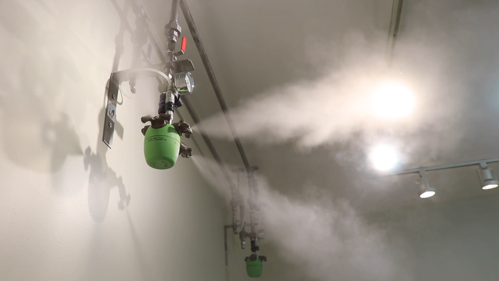 - Den Wasserzulauf schließen und das restliche Wasser im AKIMist®”E” durch Sprühen vollständig ausleeren, bis kein Nebel mehr austritt.