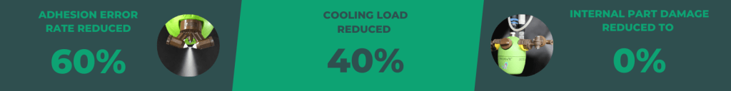 Durch die Regulierung der relativen Luftfeuchtigkeit auf etwa 50 % wird nicht nur die Produktion effizienter, sondern durch den Kühleffekt des Trockennebels auch die Temperatur um die Formmaschine herum gesenkt, was zu Energieeinsparungen führt.