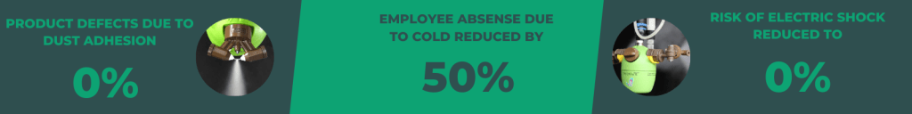 - Durch die Regulierung der relativen Luftfeuchtigkeit auf etwa 50 % wird nicht nur die Produktion effizienter, sondern durch den Kühleffekt des Trockennebels auch die Temperatur um die Formmaschine herum gesenkt, was zu Energieeinsparungen führt.