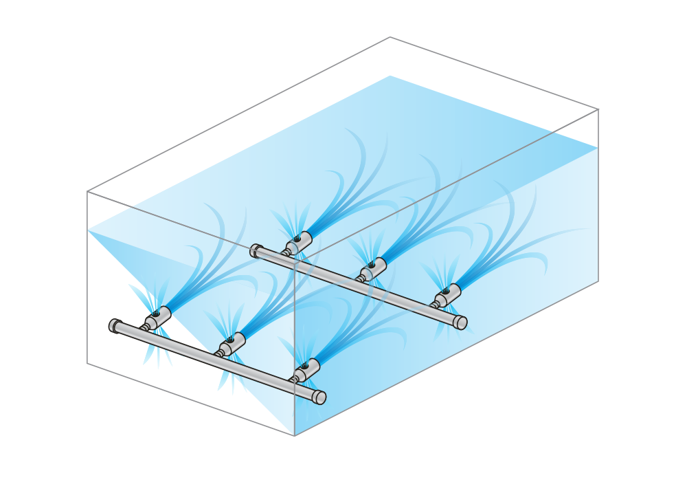 Für diesen Prozess bieten wir unsere Düsen der Serie EJX an. Die EJX ist bekannt für ihre einfache, effektive Struktur und ihr leichtes Design. Die Düse der Serie EJX spritzt 3- bis 4-mal mehr Volumen aus, als ursprünglich zugeführt wurde, wodurch sie sich ideal für die Reinigung in Flüssigkeiten eignet.