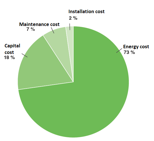 73 % der Betriebskosten eines Druckluftsystems entfallen auf die Stromkosten. Die restlichen Kosten umfassen die Anfangsinvestition, die Wartung und die Installationskosten.